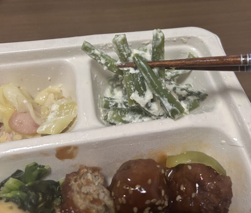 副菜2のいんげんのたらこマヨ和えは、いんげんと合っていて美味しいですが、あんまりたらこは感じませんでした。