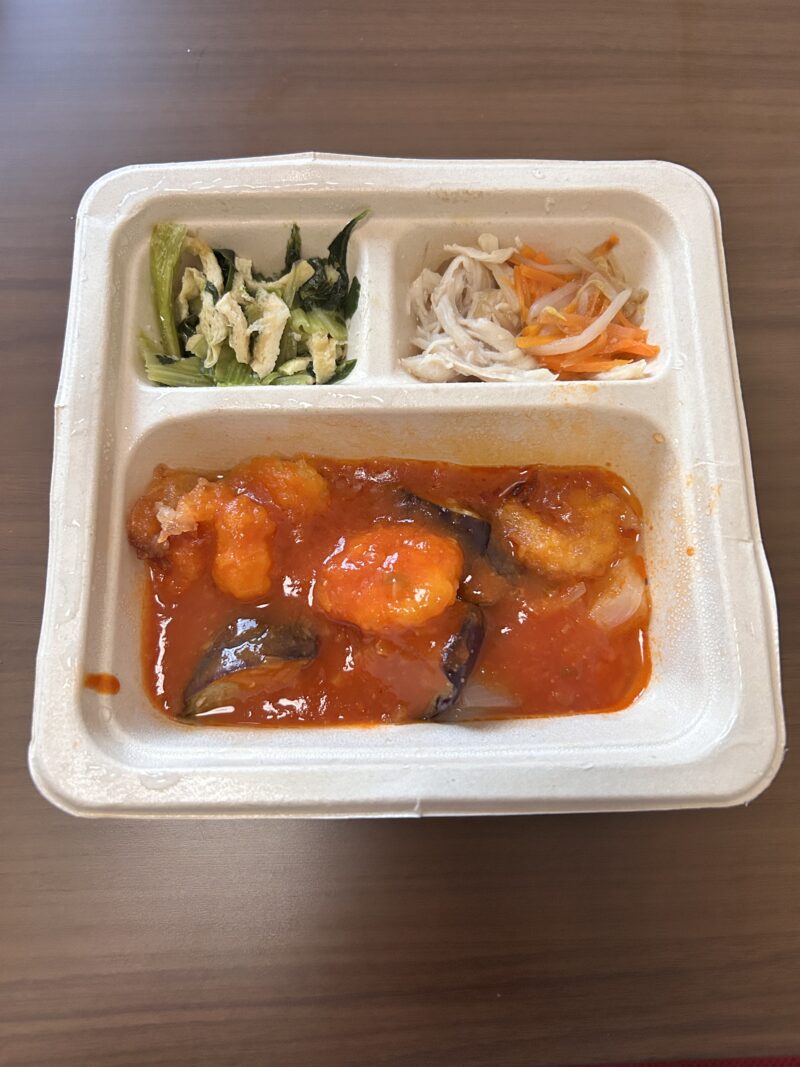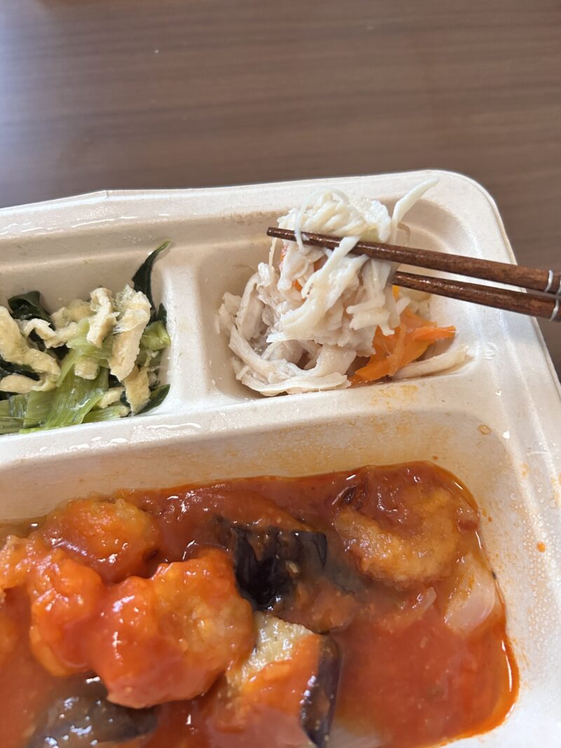 まずは副菜1の青梗菜と揚げのサラダ風は、青梗菜の苦味が意外と強くて、私は苦手な味でした。