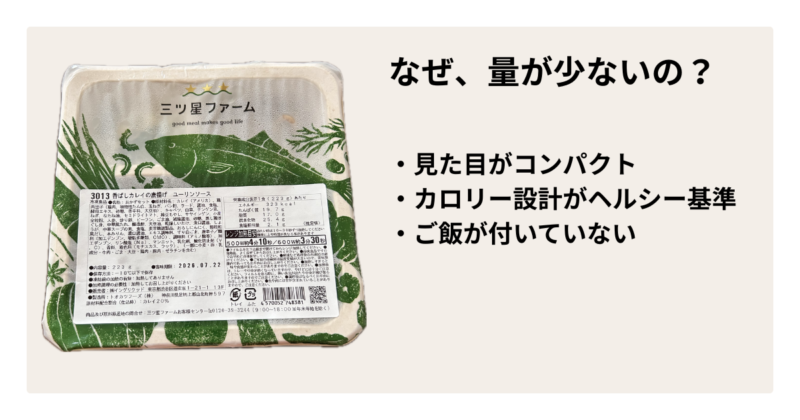 正直に言うと、コンビニ弁当と同じ感覚で考えると少なく感じます。