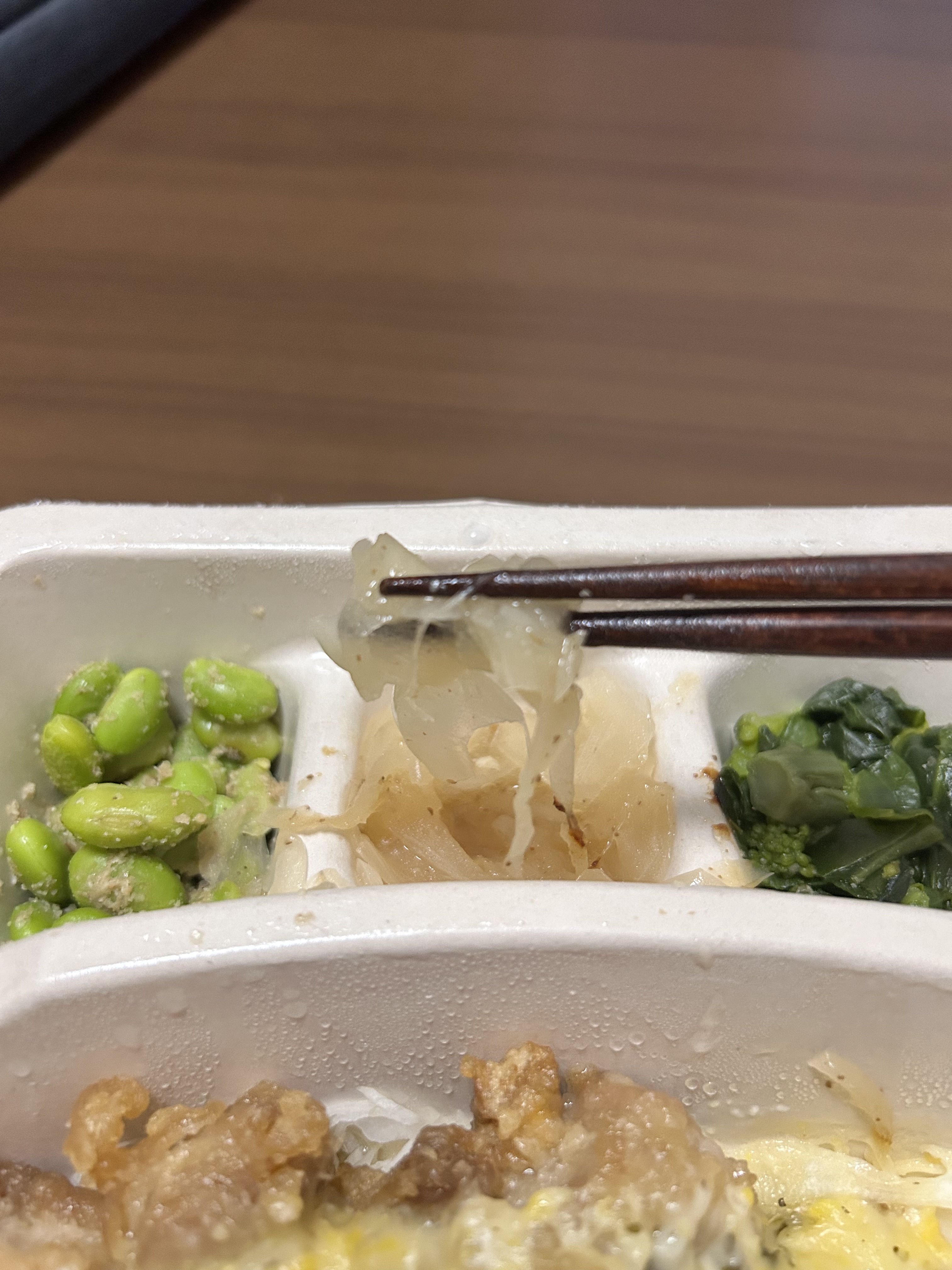枝豆のごま和えは好みが分かれそう。特に「たまねぎのごま醤油」はクセが強く、人によっては食べにくいかもしれません。副菜全体の満足度は低め。