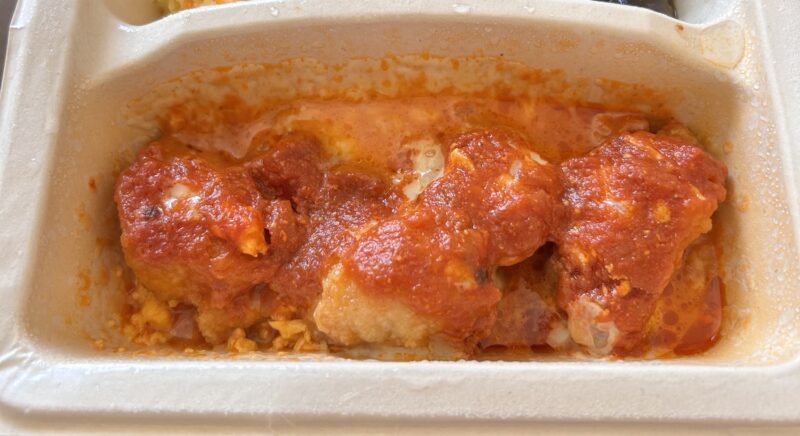 食感はパサパサ感はなく、からあげにトマトソースとチーズ絡んで個人的には美味しくてあたりのメニューと思います。